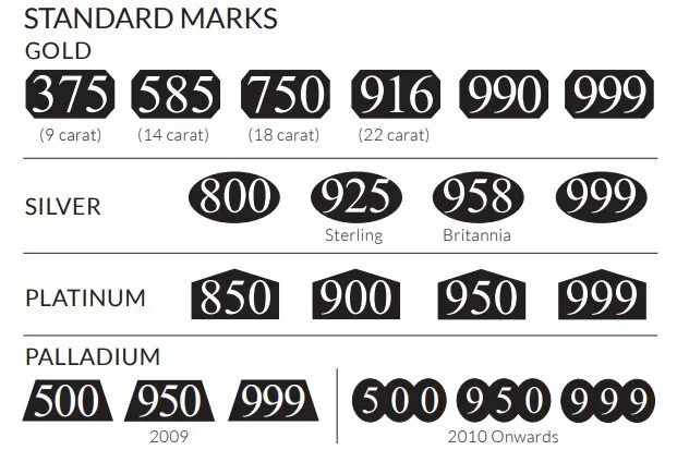 • Millesimal fineness Mark: This mark tells the type of metal, the quality of metal, as well as indicating how fine the metal is.